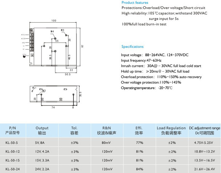 高可靠性:105C長(zhǎng)壽命電容,能承受300VAC輸入電壓5秒不損壞 100滿載老化測(cè)試 輸入電壓:88-264VAC124-370VDC 輸入頻率:47~63Hz 沖擊電流:30A@-30VAC滿載冷態(tài) 保持時(shí)間:≥20ms@230VAC滿載 過載保護(hù):110%-150%自動(dòng)恢復(fù) 過壓保護(hù):110%~145% 運(yùn)行溫度:-20-70℃" />