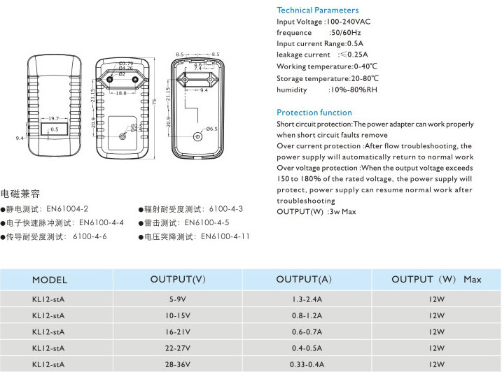 頻率:50/60Hz 輸入電流:0.5A 漏電電流:≤0.25A 工作溫度:0-40℃ 貯藏溫度:-20-80℃ 濕度:10%-80%RH 短路保護: 電源適配器在短路解除時能正常工作恢復(fù) 過流保護:過流故障排除后,電源將自動恢復(fù)正常工作 過壓保護:當輸出電壓超過額定電壓的150-180%時,電源將保護,故障排除后電源能恢復(fù)正常工作" />