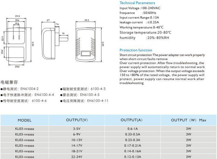 短路保護: 電源適配器在短路解除時能正常工作恢復